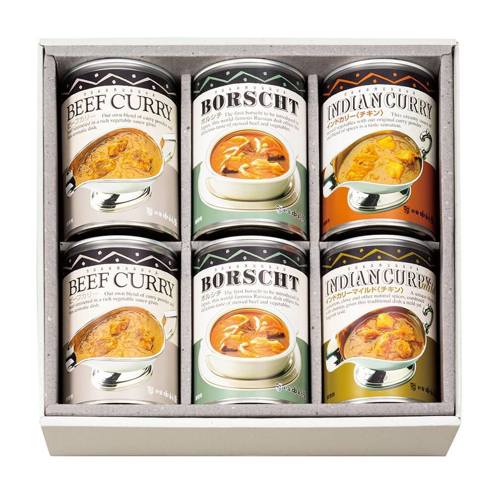 レストランの味わいを、ご家庭の食卓へ。カリー独特のスパイスの香りと風味、特製ソースの深みとコクを缶詰の中に閉じ込めました。若い方からご年配まで豊かな味を手軽に楽しめる逸品です。一缶で二人分の幸せな美味しさをどうぞ。インドカリー(チキン)クミン、コリアンダーなど数々の香辛料を使い、本場インドの風味とスパイシーな辛さに仕上げた中村屋オリジナルのチキンカリーです。食通の皆様に愛される、豊かな香りと深い味わいをお届けします。インドカリーマイルド(チキン)クローブやシナモンなど20数種の香辛料を加え、丁寧に煮込んで仕上げました。コクのある味わいを生むチャツネが、マイルドな辛さの秘訣。じっくり炒めた野菜でとろみをつけた、本格風味のチキンカリー。ビーフカリー牛肉をたっぷり使い、クミン、コリアンダーなど数多くの香辛料で豊かな風味に仕上げた本格的なビーフカリーです。素材が醸し出す深いコクは、中村屋ならではのおいしさ。スパイシーな辛さが広がります。ボルシチコクのあるトマトベースのスープにスパイスをほどよく効かせ、大きく切った牛肉と8種類の野菜を入れてじっくり煮込みました。ロシアの代表的な家庭料理をお楽しみいただけます。