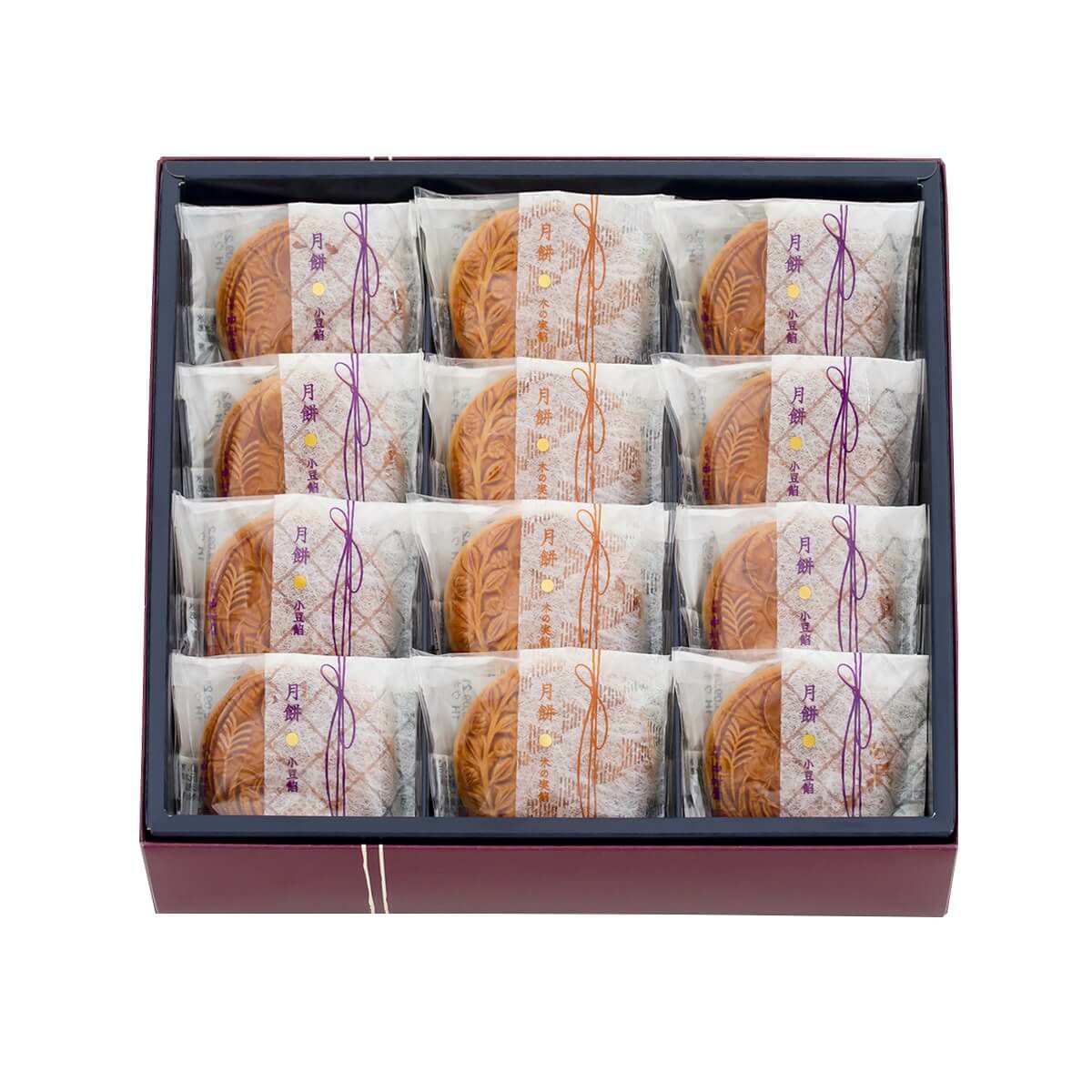 くるみ入りのしっとりとした小豆餡と、多彩なフルーツの砂糖漬けとナッツが入った木の実餡の2種。中村屋伝統の味です。月餅(小豆餡)ごま風味の良いしっとりとした小豆餡にくるみを加えた餡を、香ばしい生地で包んだ月餅です。月餅(木の実餡)11種類のフルーツやナッツ類をミックスした木の実餡を香ばしい生地で包んだ月餅です。
