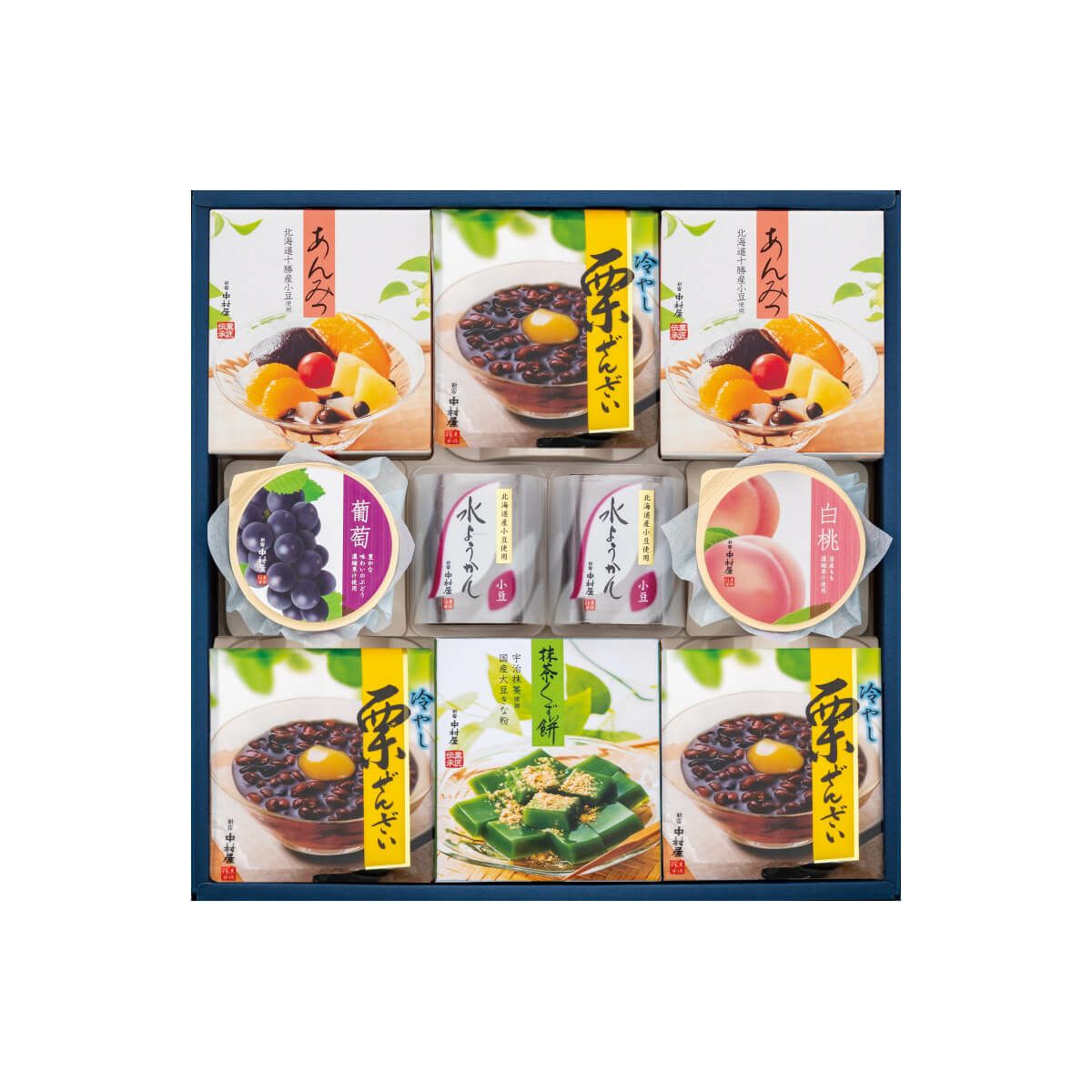 あんみつ 2個栗ぜんぜい 3個抹茶くず餅 1個涼香水ようかん 小豆 2個フルーツゼリー 白桃 1個フルーツゼリー 葡萄 1個
