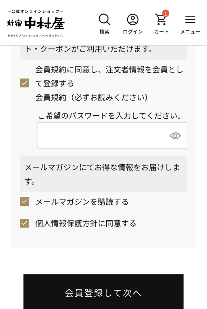 会員登録されない場合は、ここのチェックを外してお進みください。 - ご希望のパスワードを入力してください。